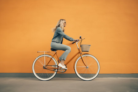 Full-length body size side profile photo of a cheerful girl riding bicycle on vibrant color background.
