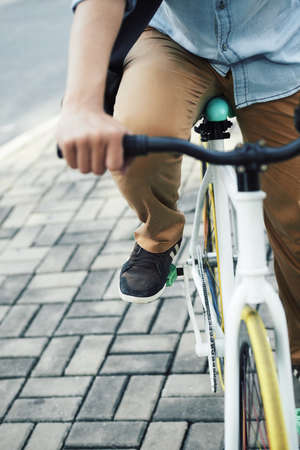 Young hipster man in casual summer cloths riding his fixed gear bike along the bike lane on city street. Shot young guy biking bicycle on road