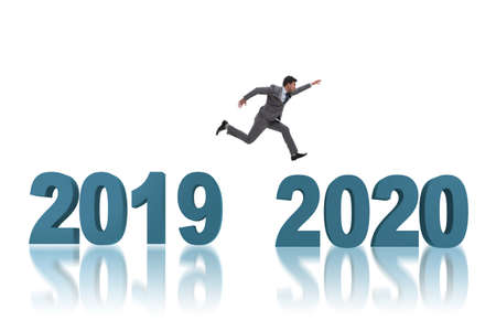 Silhouette of young business mans jumping from the cliff that has the year number 2019 to the side that has the year number 2020 with sun rise at the sea background, Concept for new year target.
