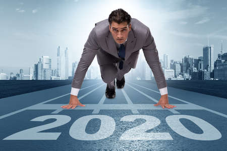 Businessman holds wooden blocks with the inscription 2020 and an up arrow. The forecast concept for 2020. Business forecasting. Growth and development of business and economy. Investments
