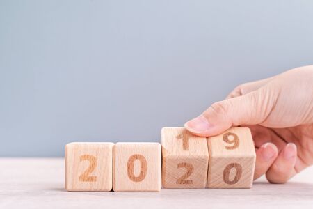 Abstract 2020 & 2019 New year countdown design concept - woman holding wood blocks cubes on wooden table and blue background, close up, copy space.