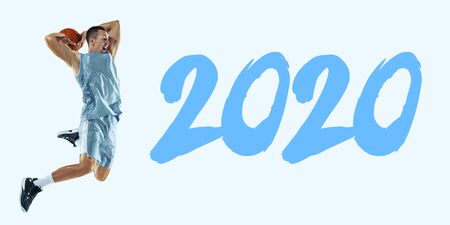 2020 Year meeting. Young caucasian basketball player in action, motion in jump isolated on blue background. Concept of sport, movement, energy and dynamic, healthy lifestyle. Training. Flyer for ad.