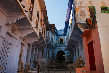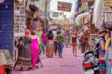Pushkar, India - December 7, 2015: Lilac and pink building in a busy street of Pushkar taken on a winter sunny afternoon.