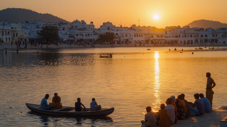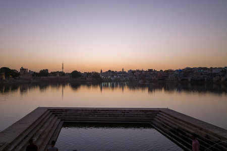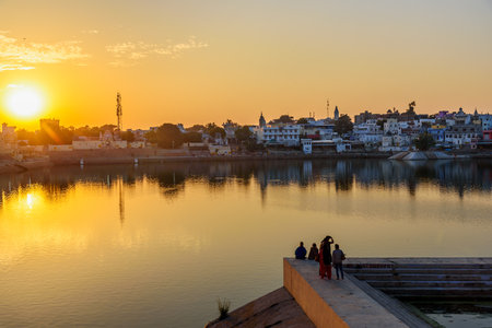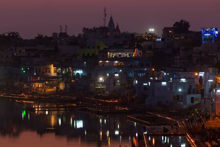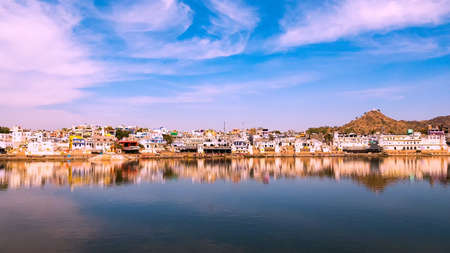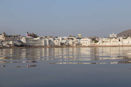 Cityscape at Pushkar, Rajasthan, India. Temples, buildings and ghats reflecting on the holy water of the lake at sunset.