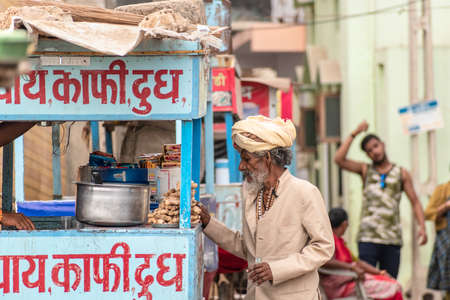 Somnath, Gujarat, India - December 2018: An elderly Indian man wearing a turban buying tea from a street stall in the old city.