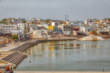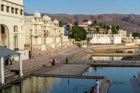 Pushkar, Rajasthan in India, February 13, 2019: Holy lake in Pushkar city view