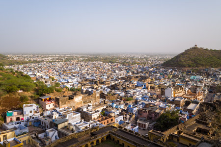 Bundi, India - March 20, 2022: The image shows an aerial view of Bundi with a dense cluster of blue and yellow buildings, historic structures, and a green hill with a small pavilion on top under a clear sky.