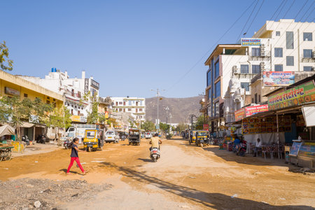 Pushkar, India - March 17, 2022: A wide dirt street is shown with pedestrians, motorcycles, auto rickshaws, parked vehicles, and various shops and restaurants, with signage in Hindi and English and hills visible in the background under clear daylight.