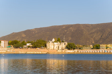 Pushkar, India - March 17, 2022: Pushkar Lake is visible with several ghats, historic buildings, people near the water, and hills in the background under clear daylight.