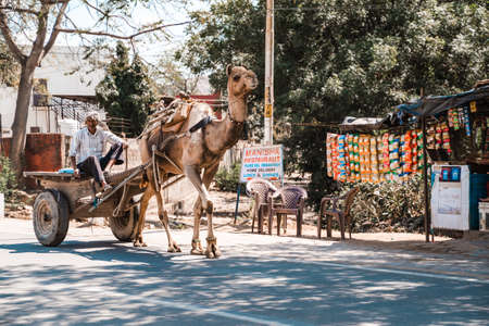 Sawai Madhopur, India - March 7, 2020: Indian man gets pulled by a cart with a camel along the side of the road