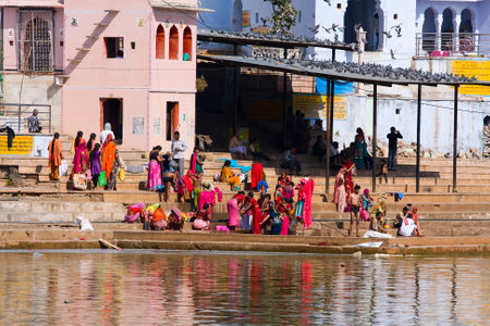 PUSHKAR, INDIA - NOVEMBER 20, 2012: Hindu pilgrims bathing in sacred Lake Pushkar (Sarovar) on ghats. Countless people in colourful attire gather to take a dip in the Holy Lake and pray to deities.