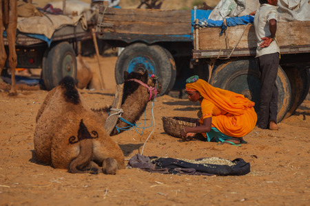 PUSHKAR, RAJASTHAN, INDIA - CIRCA NOV 2012: Traditional Fair in Pushkar. Woman collects camels shit - fuel for fire
