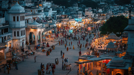 A lively evening market scene captures the essence of Indian culture. Colorful lights illuminate the crowded square, creating a vibrant atmosphere of community and celebration.