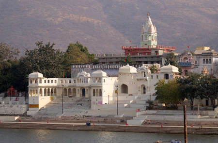 Ghats and temple at Pushkar holy lake in Rajasthan. India