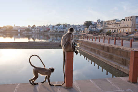 Gray langurs on the ghat in Pushkar, India. It is a pilgrimage site for Hindus and Sikhs in Rajasthan state