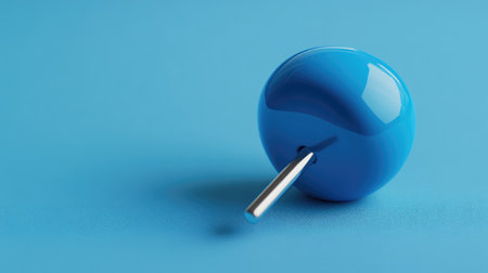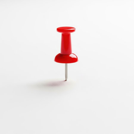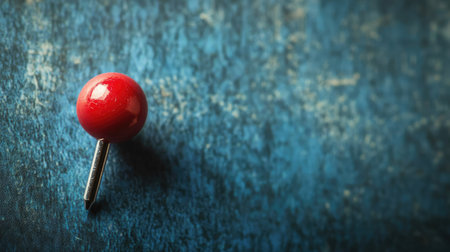 A vibrant red pushpin stands prominently on a light blue surface, casting a distinct shadow, showcasing minimalist design and appealing composition.