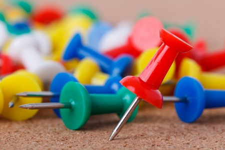 Collection of various pushpins on cork board with leading red pin