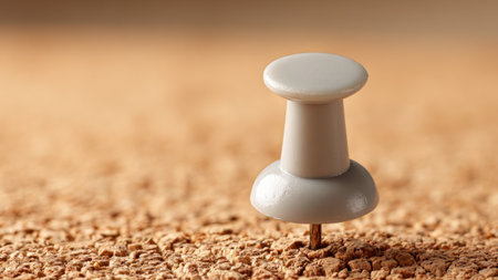 A push pin is firmly placed on a corkboard. The cork surface shows a textured finish, and the push pin stands upright, ready to hold items like notes or pictures.