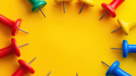 This vibrant image features colorful push pins arranged in a circle on a bright yellow background, creating an engaging visual perfect for organizational themes.