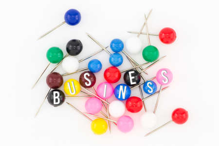 Business, colorful paper pins with conceptual words. Isolated on white background.