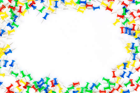 Set of push pins in different colors. frame of thumbtacks on white. Top view.Push pins isolated on white background. colourful push-pin thumbtack tools office on white background
