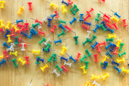thumbtacks of colors on old wood top view
