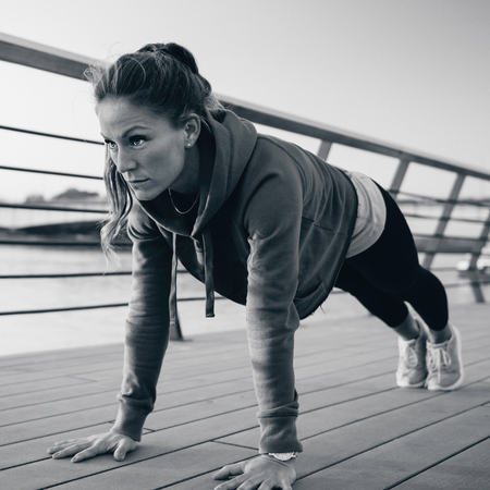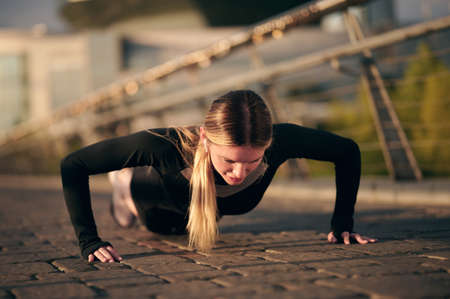 Horizontal portrait of a sportswoman, determined female athlete doing push-up while practicing a cross workout, bodyweight training on the city bridge at dawn. Sport, active lifestyle concept