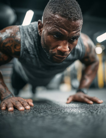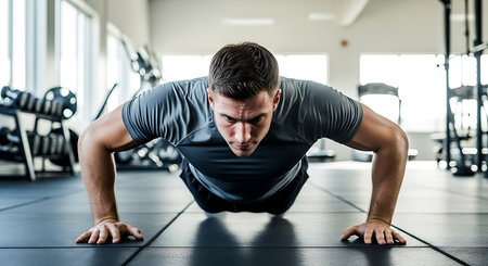 Young man doing push ups on gym floor, sweating and focusing during workout