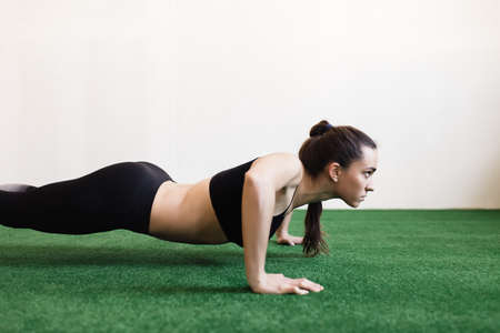 Strong woman practicing yoga, doing four limbed staff, Push ups exercise, chaturanga dandasana pose, working out, wearing sportswear, listening music in headphones