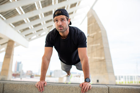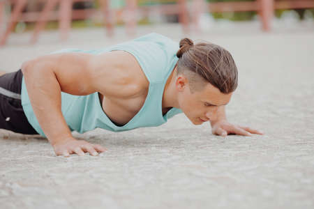 Confident young sportsman doing exercices outdoors, doing push-ups