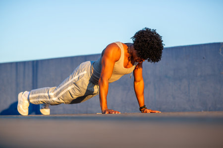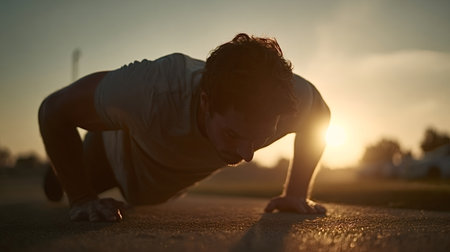 Strong young man performing push-ups on a concrete surface under warm sunset light. Outdoor workout scene emphasizes strength, endurance, and a healthy lifestyle