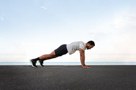 Fit african american man in sportswear doing push ups on a coastal road. healthy lifestyle, exercising in nature.