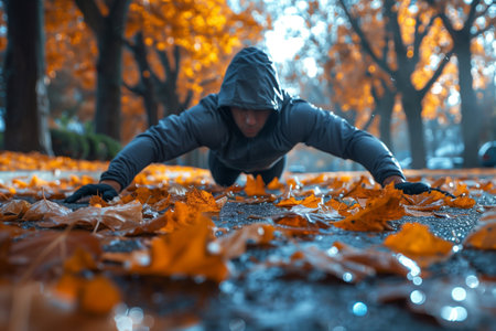 Man Doing Push Ups in Autumn Leaves on a Rainy Day