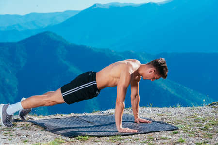 Handsome athlete ( sportsman ) doing push ups on top of a mountant whit an amazing view on the landscape.