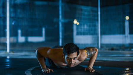 Strong Muscular Fit Shirtless Young Man is Doing Push Up Exercises. He is Doing a Workout in a Fenced Outdoor Basketball Court. Night After Rain in a Residential Neighborhood Area.
