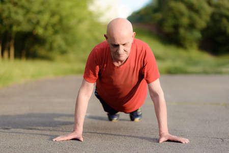 Portrait of a fit handsome sportsman doing plank exercise, practicing pushs up on track road, dressed in sportswear, outdoors