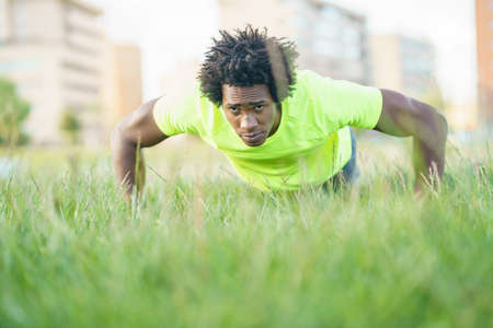 Black man doing push-ups exercising his chest on the grass of an urban park.