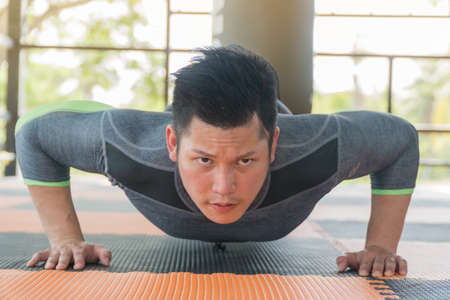 Active Asian sportsman making a body weight exercise, man doing push up workout with dumbbell. Intensive bodybuilding workout training.