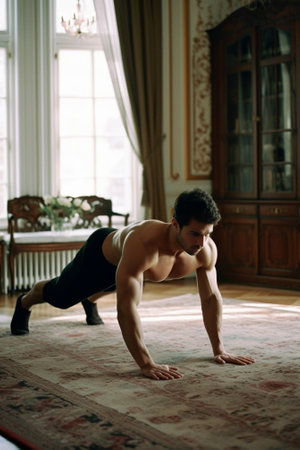 Full length of handsome young man doing fitness training at home while standing on the carpet : Generative AI
