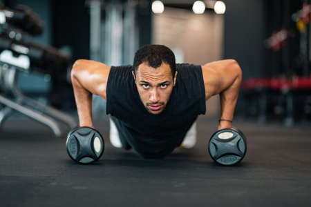 Young African American Sportsman Making Push Up Exercise With Dumbbells At Gym