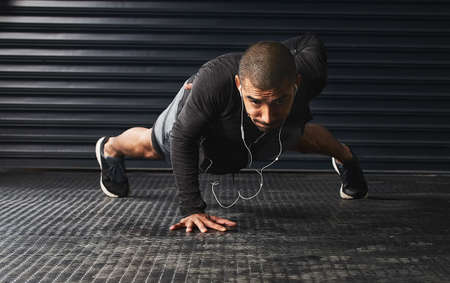 What hurts now will one day be your warm up. Shot of an athletic young man doing pushups in the gym.