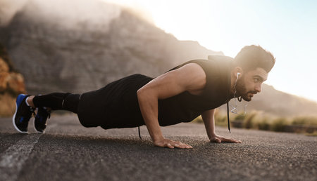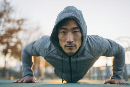 Determined young man in sports clothing keeping plank position while exercising outdoors : Generative AI
