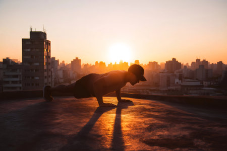 Silhouette of a sportsman doing push ups on a rooftop at sunrise with a cityscape in the background