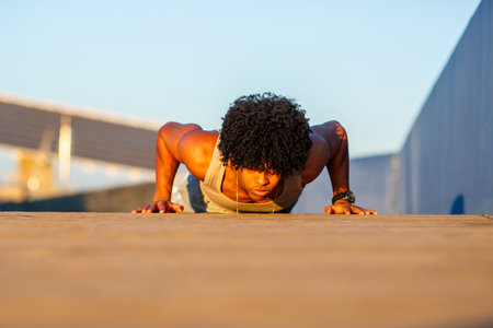 Focused young man with curly hair performs a push-up exercise on a boardwalk, bathed in warm sunset light, demonstrating strength and discipline