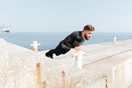 Portrait of an athletic man doing push-ups at the beach. Sport and healthy lifestyle concept.
