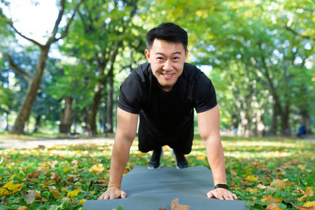 Portrait of happy male athlete, Asian looking at camera and smiling doing physical exercises, push-ups and plank in autumn park on sunny day.
