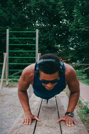 The young fit man with sunglasses and headphones doing push-ups in the park