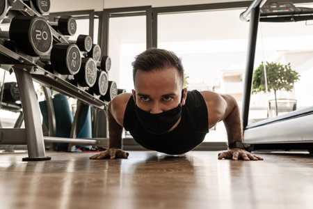Young athletic man wearing a prevention face mask during his workout in the gym