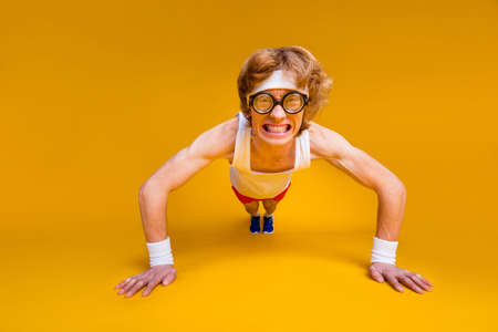 Portrait of his he nice funky motivated mad desperate foxy guy doing work out body building goal squatting endurance isolated over bright vivid shine vibrant yellow color background
