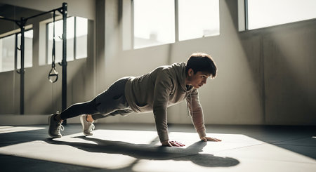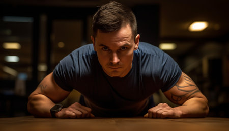 Determined young man in sports clothing keeping plank position while exercising outdoors : Generative AI